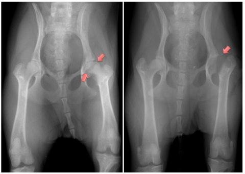 成長期に発症する遺伝性疾患で、小型犬に多く認められ、股関節を形成する大腿骨の頭側部への血液供給が不足し、骨頭が壊死してしまう病気です。重篤な場合は、非常に強い痛みを伴い、神経的な疾患とまちがえるほど歩行が困難となります。