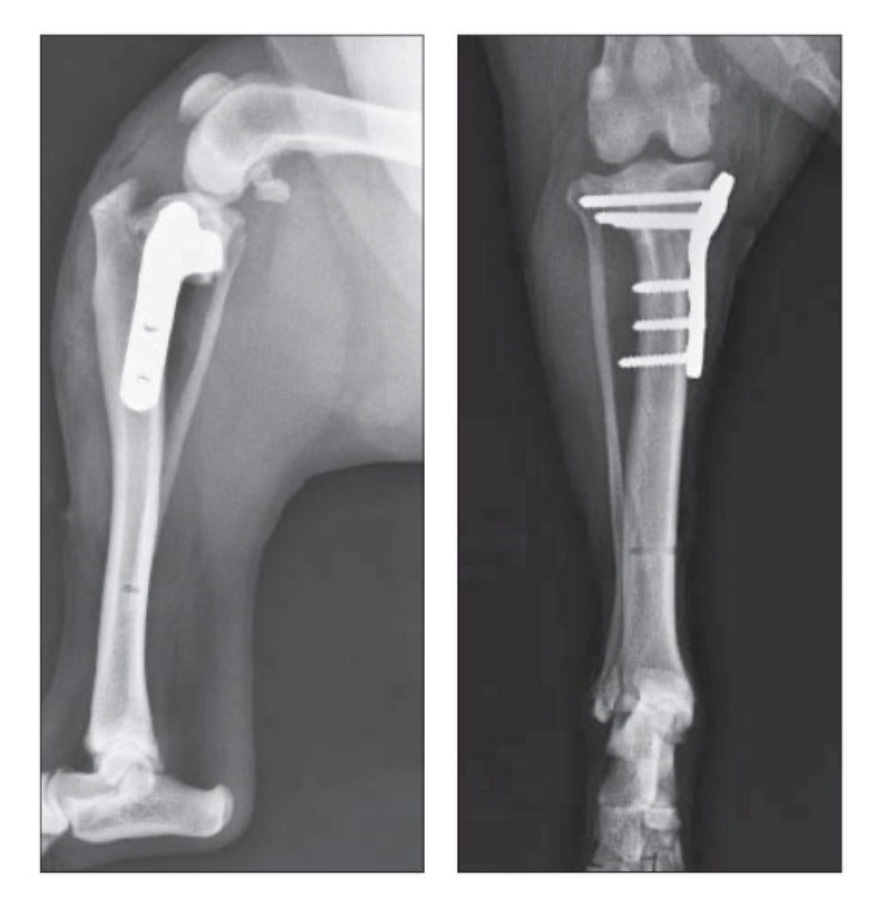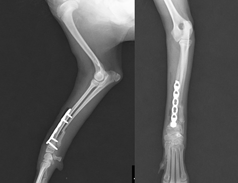 小型犬に頻発する骨折の一つである「橈尺骨(とうしゃくこつ)骨折」(前肢の骨折)は、的確な手術を行い強固な安定化をはからないと、骨が癒合しないケースも多く、特に注意しなければならない骨折の一つです。