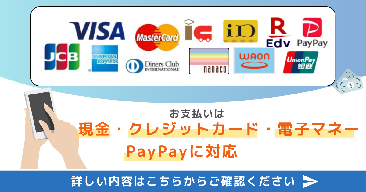 現金のほか、クレジットカードおよび電子マネー、 PayPay をご利用いただけます。
